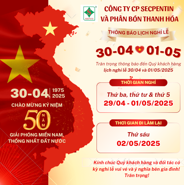 Nhân dịp kỷ niệm 50 năm ngày lễ trọng đại của dân tộc, Công ty CP Secpentin và Phân bón Thanh Hóa xin gửi đến Quý khách hàng, Quý đối tác lời tri ân chân thành, kính chúc Quý vị có một kỳ nghỉ lễ vui vẻ, an toàn, đầm ấm bên gia đình, tràn đầy niềm tự hào dân tộc và khát vọng cống hiến.